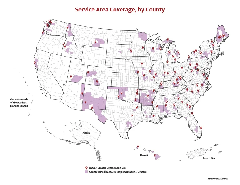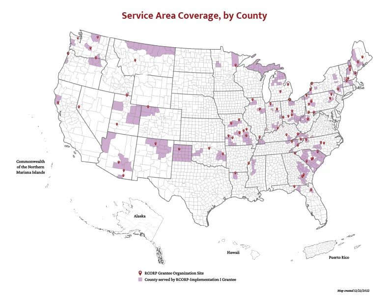 RCORP-Implementation aims to strengthen and expand SUD/OUD prevention, treatment, and recovery services in rural areas. It does so through workforce development and training, telehealth, health care integration, and family support services. Grantees receive up to $1 million each, over a 3-year period of performance (POP), to implement a set of evidence-based interventions and promising practices that align with the U.S. Department of Health and Human Services' (HHS) Overdose Prevention Strategy. Additionally, grantees will develop plans to sustain services beyond the POP.