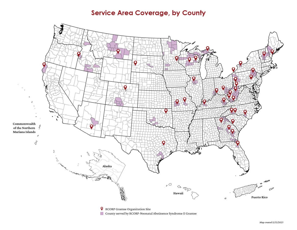 RCORP-NAS strives to reduce the incidence and impact of NAS in rural communities by improving systems of care, family supports, and environmental, socio-economic and non-medical factors contributing to health outcomes. Grantees receive up to $500,000 each, over a 3-year POP, to conduct a combination of prevention, treatment, and recovery activities designed to improve systems of care, family supports, and environmental, socio-economic and non-medical factors contributing to health outcomes. While the focus of RCORP-NAS is primarily OUD, grantees may also choose to address additional substances of concern or SUDs among intended populations. These include pregnant women, mothers, and women of childbearing age living in rural areas, who have a history of, or are at risk for, SUD/OUD as well as their children, families, and caregivers.